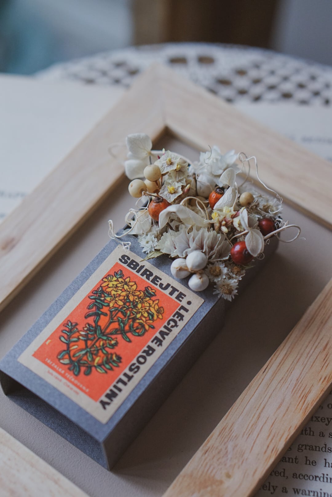 ドライフラワーを丁寧に重ねた小さなアートフレーム作品です。