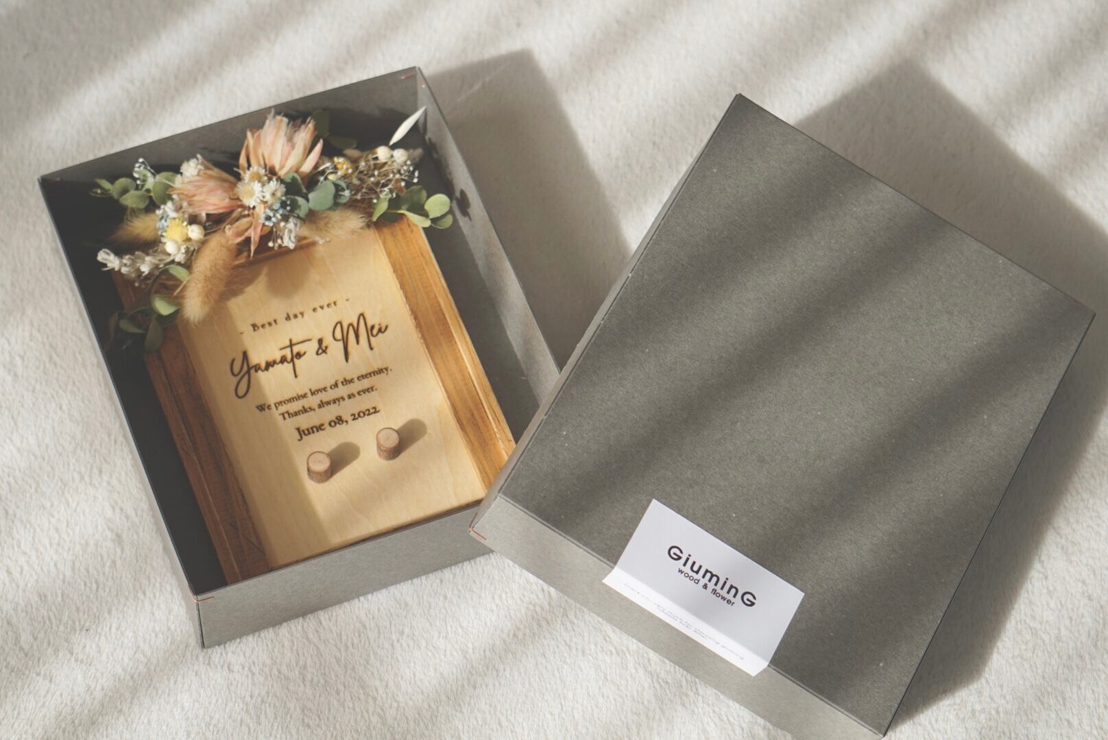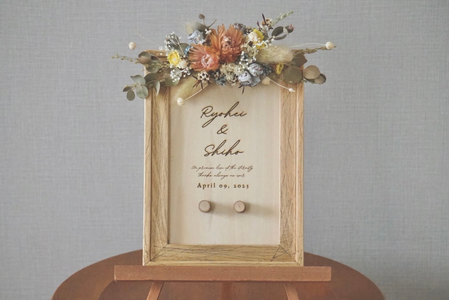 フラワーアレンジ付きの木製フレームのリングピローです。
